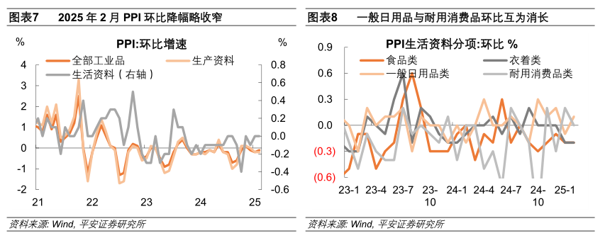 2025年2月PPI环比为-0.1%,PPI同比为-2.3%,降幅均比上月收窄0.1个百分点。其中,生产资料价格环比为-0.2%,生活资料价格环比0,均持平于上月。生活资料中,一般日用品价格环比为0.1%,较上月上升0.2个百分点,耐用品价格环比为0,较上月下降0.2个百分点,二者互为消长。特别是,文教工美体育和娱乐用品制造业价格环比涨幅达到1.1%,相比上月0.3%涨幅扩大较为明显。
