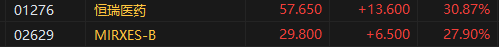 5月23日消息,港股三大指数高开高走。截至午间收盘,恒生指数涨0.58%,报23679.99点,恒生科技指数涨0.61%,国企指数涨0.75%。盘面上,科网股全线上涨,哔哩哔哩涨超5%,美团、网易、百度集团涨超1%;生物医药板块狂飙,新股恒瑞医药、MIRXES分别涨超30%、28%;影视股齐涨,阿里影业涨超11%。