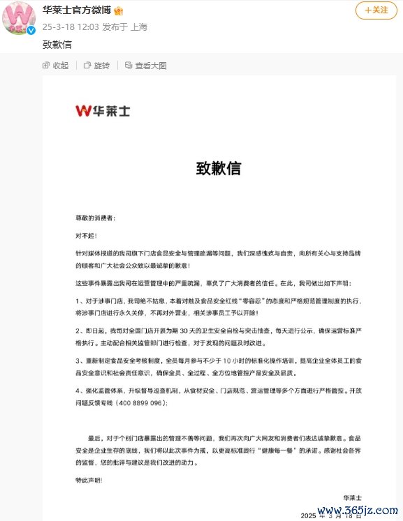 华莱士被曝食品安全问题,官方回应:涉事门店永久关停,开除涉事员工华莱士被曝食品安全问题,官方回应:涉事门店永久关停,开除涉事员工