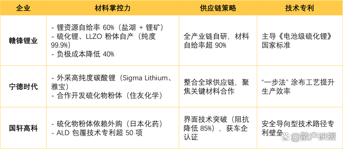 电解质:硫化锂、LLZO 粉体自产,硫化物电解质成本较外购低 50%,且纯度领先同行(赣锋硫化锂纯度 99.9% vs 行业平均 99.5%)。