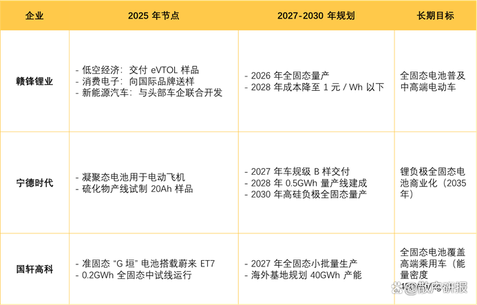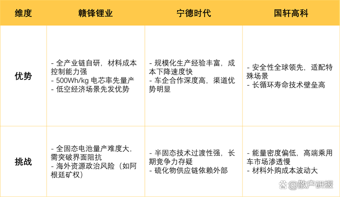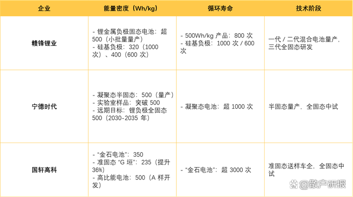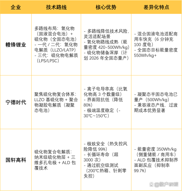 宁德时代、国轩高科、赣锋锂业的固态电池技术对比: